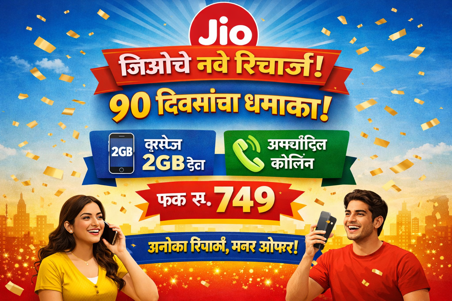 जिओचा 90 दिवसांचा प्लान दररोज 2 जीबी डेटा आणि अमर्यादित व्हॉईस कॉलिंगसह येतो. Jio New Recharge